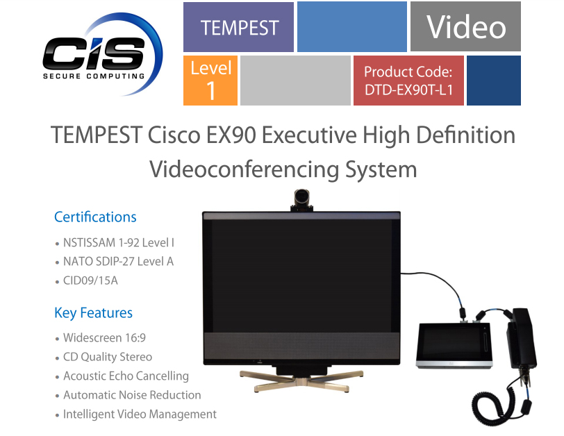 There's also no reason why there should be such a series of devices when it comes to encryption: both video and audio from the standard Cisco equipment can easily be encrypted by a single network encryptor, like from General Dynamics's TACLANE series. In this way, the Defense Information Systems Agency (DISA) provides secure video teleconferencing over its Secret (SIPRNet) and Top Secret/SCI (JWICS) networks.